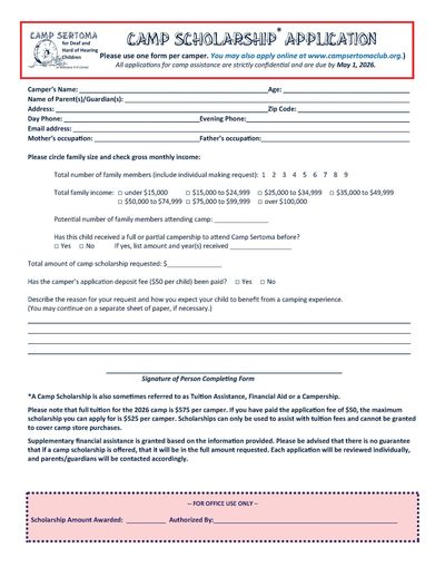 A camper must be fully registered for Camp Sertoma to be considered for a camp scholarship. Camp scholarship applications are due by May 1 -- to allow sufficient time to review applications. Please note: Families may apply for assistance, not to exceed $525 per camper.